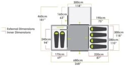 The tent has four zones: a rear storage area to de-clutter the main body of the tent, a very generous sleeping area (with a master bedroom) to accommodate any air bed or camp bed, a big living area to make sure you are never short of space (especially on those rainy days) and a ample front awning section giving you a great wet/dry area before entering, which can also be used to create the perfect shelter cooking spot. An additional annexe can be zipped onto the side of the tent to give another storage space or a toilet location so that you don’t have to go far in the middle of the night.