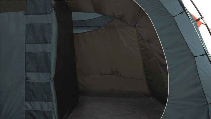 A solid 3,000mm HH waterproof rating is a great spec for the price point and as it has a sewn-in groundsheet the tent inside is sealed away from the wind and rain. Colour co-ordinated poles make it easy to pitch, as seen from our Attwoolls Pitching videos. The bedroom compartment is made from Easy camp’s sleep tight material to reduce early morning light and hopefully you don’t wake you when the sun rises. The inner also has storage pockets built into the tent to allow you to locate torches and phones in the middle of the night. Windows are located on either side of the tent to give a view outside and curtains can toggle up into place to provide privacy when needed. Covered ventilation panels are located behind the bedroom section at each end of the tent to increase airflow and help reduce condensation. A toggled inner divider splits up the bedroom section and can be easily removed to make one big sleeping space.
