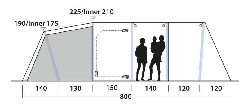 The internal height of the Lakeville is immense regardless of how tall you are. This is because of Outwell’s Gothic Arch style air tubes and well-designed floor space which makes the tent feel bigger than it is. Throughout the tent, there are beautifully large tinted windows which allow plenty of light to flood in while giving an element of privacy. Curtains are in place in every window to take that privacy to the next level and keep the sunlight from waking you up. The Dark Premier Bedrooms are now even darker thanks to the new colour and a darker material above the inner.
