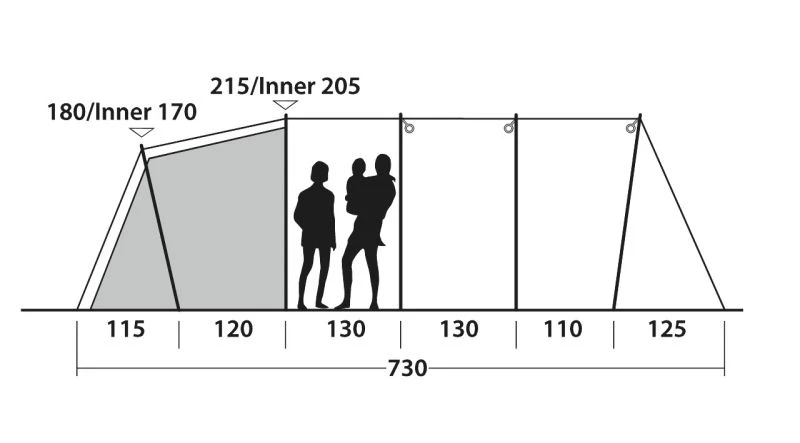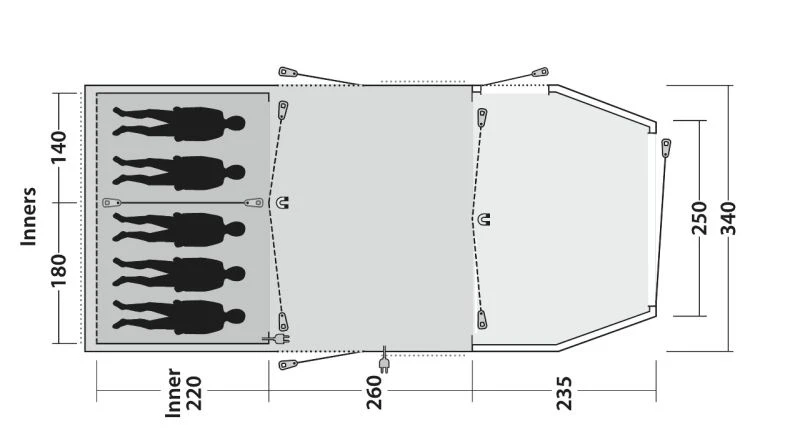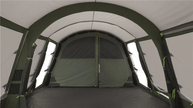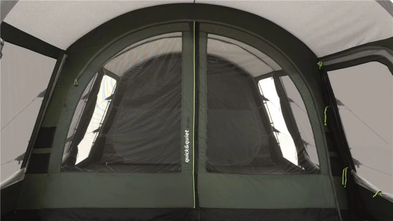 Not only does the tent come with high-vis guylines, but also ‘Storm Ties’ Velcro around the 19mm steel poles to make sure the fabric and poles are tensioned together, while storm straps are provided front and back to increase stability. Outwell have really gone to town on including things like their own HookTrack System to give you the option to have a hanging point for lights or storage pockets throughout the tent. ‘Quick & Quiet’ Access doors are located on the bedroom compartment and the living room door. Premier Bedrooms which are nice and dark and have a Rear Ventilation System built in to increase the airflow and help reduce condensation (this can be covered to keep the bedroom nice and dark if needed).