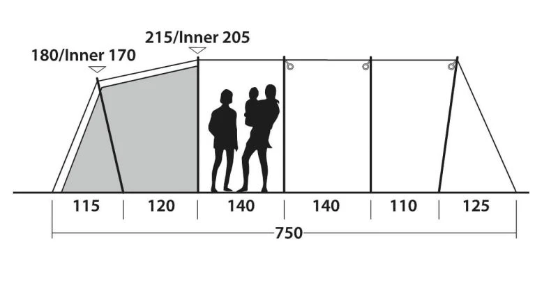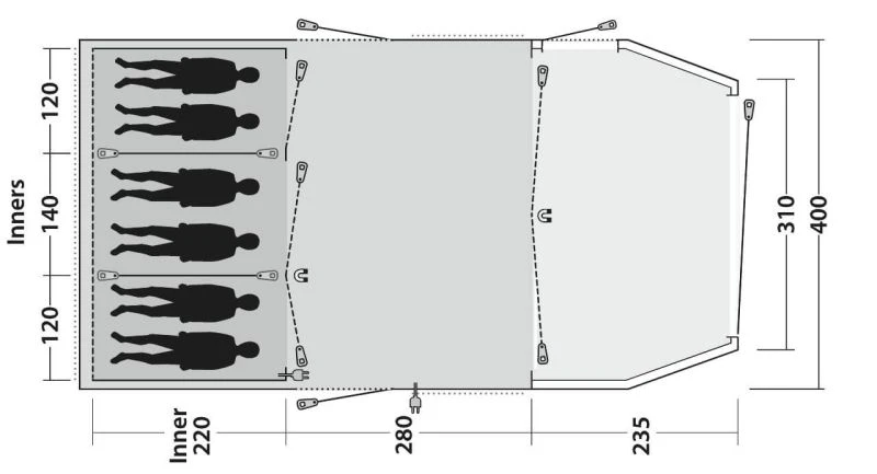 Not only does the tent come with high-vis guylines, but also ‘Storm Ties’ Velcro around the 19mm steel poles to make sure the fabric and poles are tensioned together, while storm straps are provided front and back to increase stability. Outwell have really gone to town on including things like their own HookTrack System to give you the option to have a hanging point for lights or storage pockets throughout the tent. ‘Quick & Quiet’ Access doors are located on the bedroom compartment and the living room door. Premier Bedrooms which are nice and dark and have a Rear Ventilation System built in to increase the airflow and help reduce condensation (this can be covered to keep the bedroom nice and dark if needed).